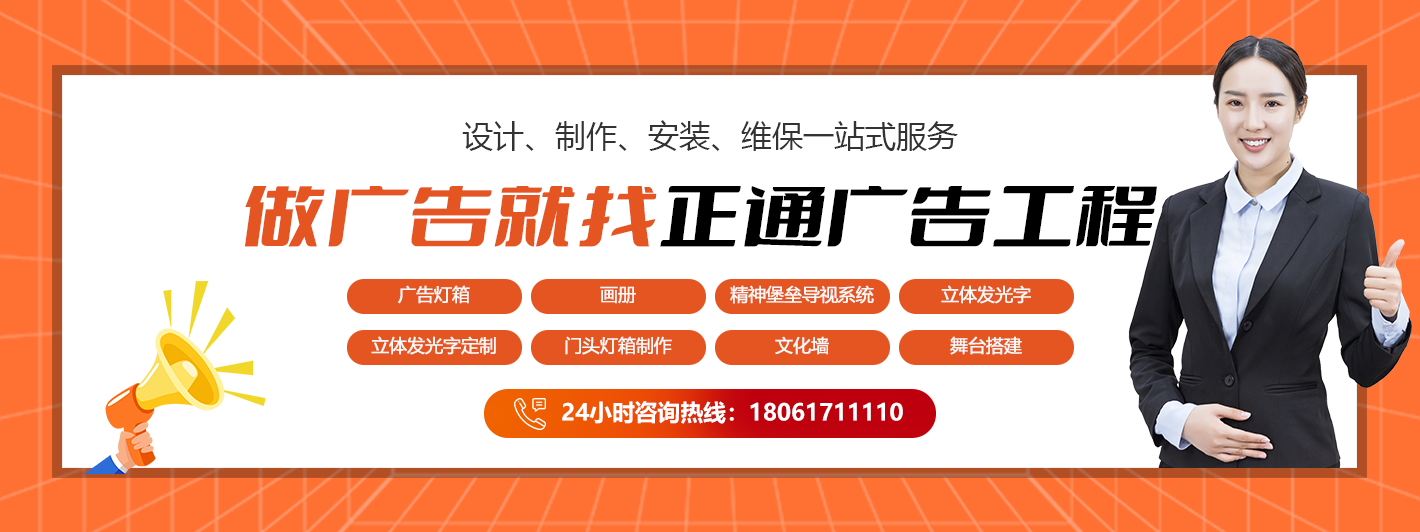 南京正通廣告工程有限公司以南京為中心輻射附近省市,專(zhuān)注于企業(yè)廣告一站式服務(wù)的企業(yè)。我們擁有專(zhuān)業(yè)設(shè)計(jì)、制作、 生產(chǎn)、安裝等年輕的技術(shù)隊(duì)伍,有先進(jìn)的現(xiàn)代化設(shè)備,能夠?yàn)榭蛻籼峁﹥?yōu)質(zhì)、高效、專(zhuān)業(yè)的服務(wù)。正通廣告以客戶的需求為發(fā)展目標(biāo),始終以質(zhì)量保證,誠(chéng)信經(jīng)營(yíng),完美服務(wù)的理念,竭誠(chéng)為客戶提供優(yōu)質(zhì)的產(chǎn)品和完善的服務(wù),贏得諸多客戶的信賴(lài),歡迎廣大新老客戶蒞臨指導(dǎo)。